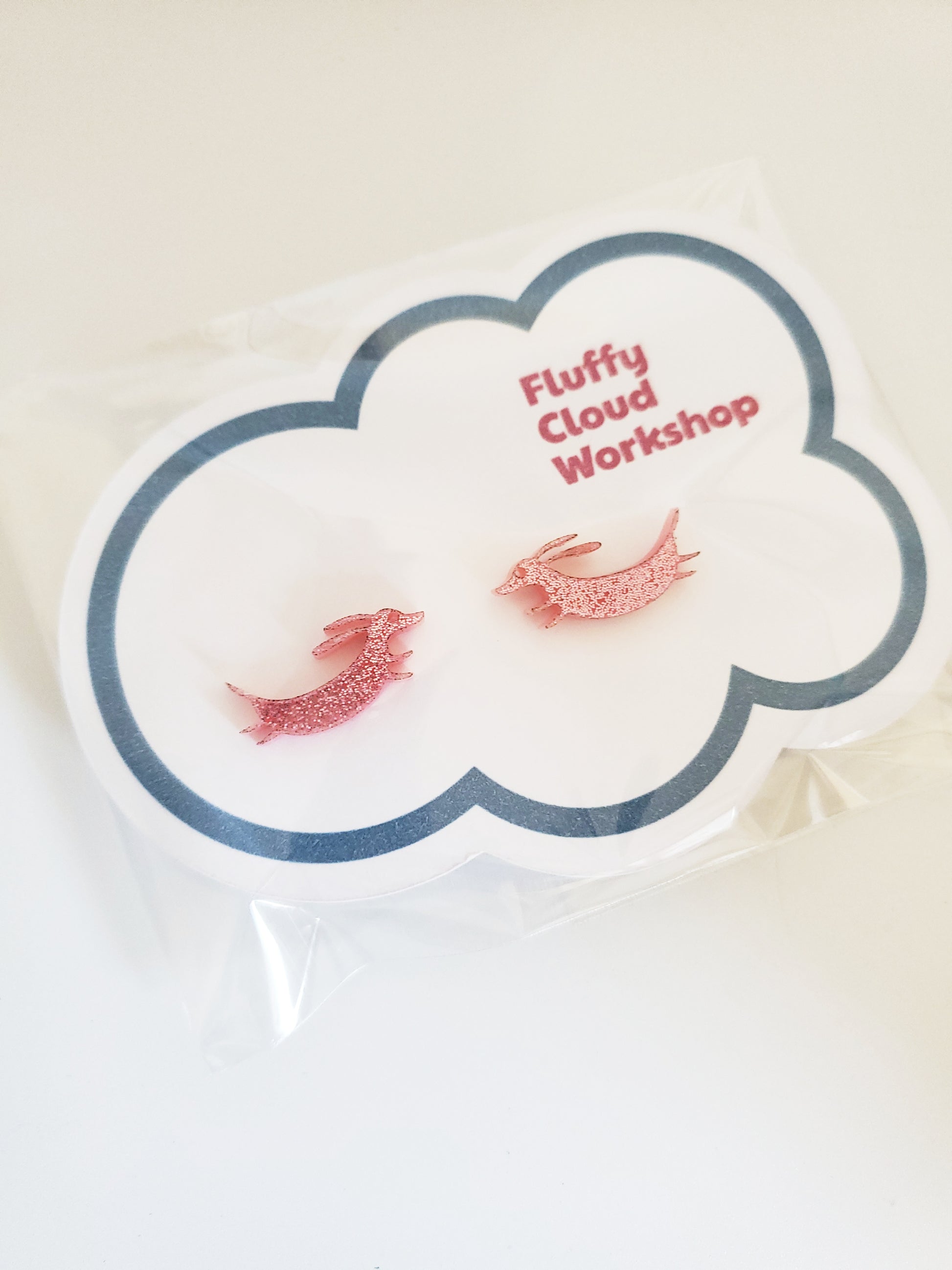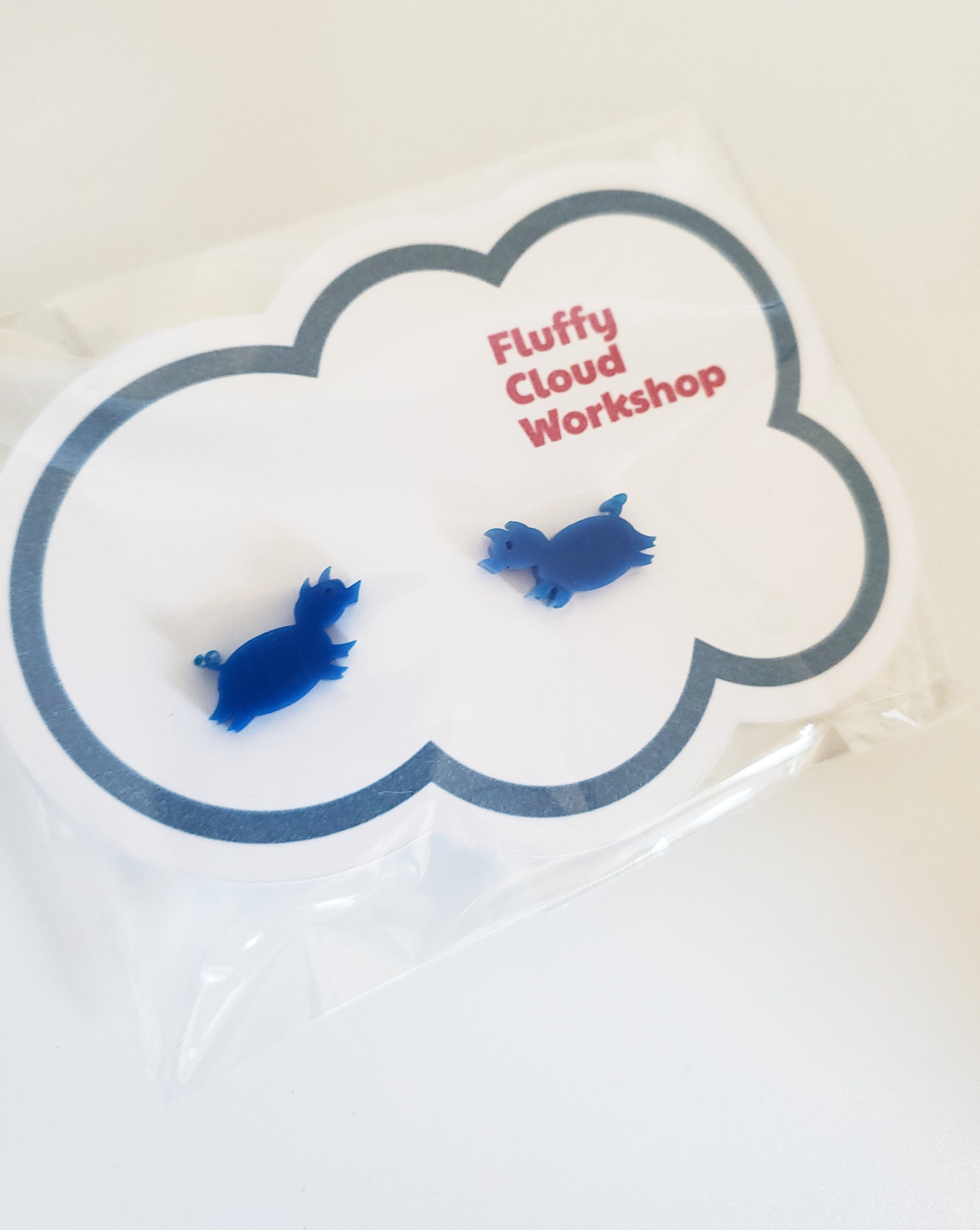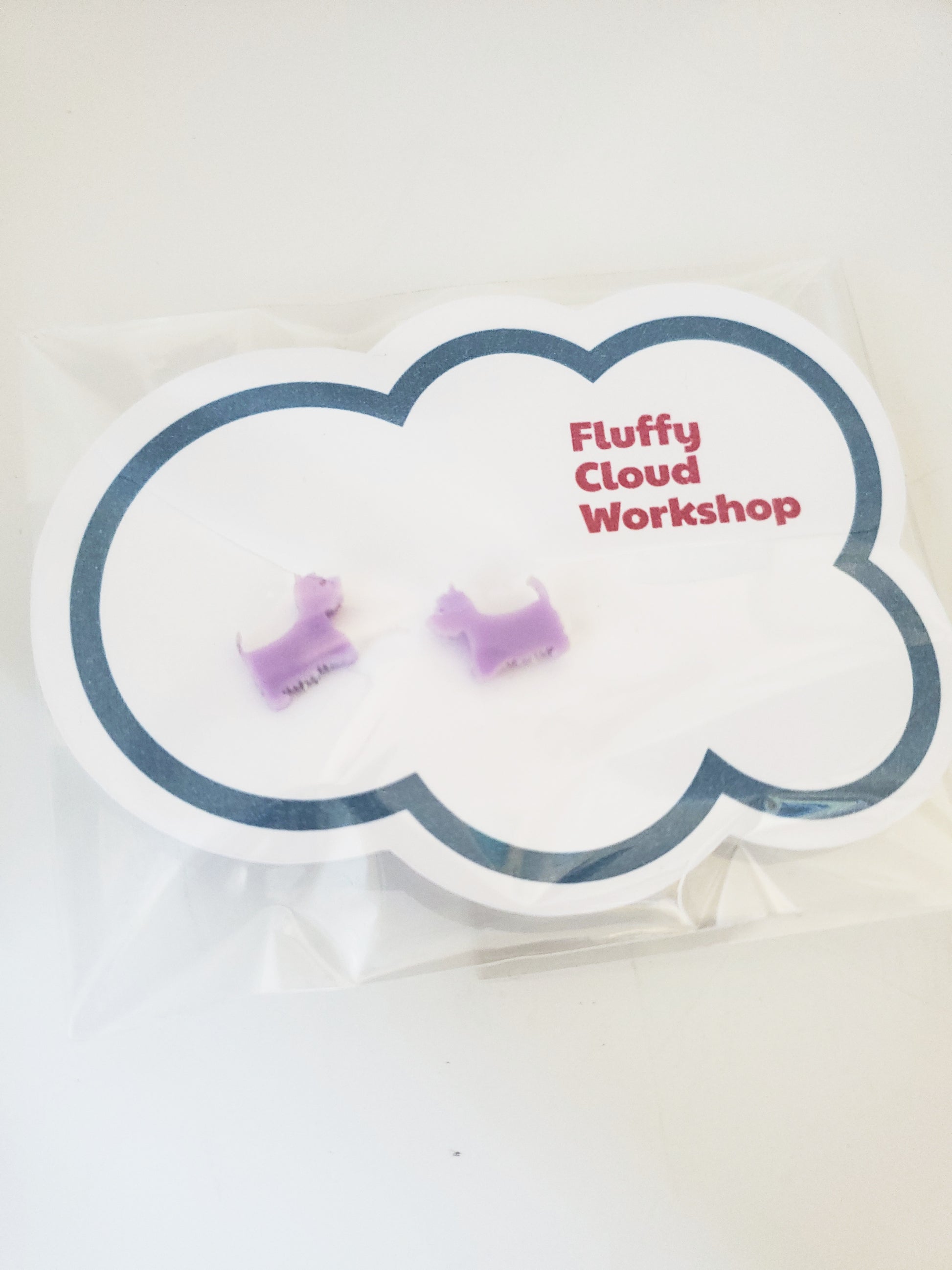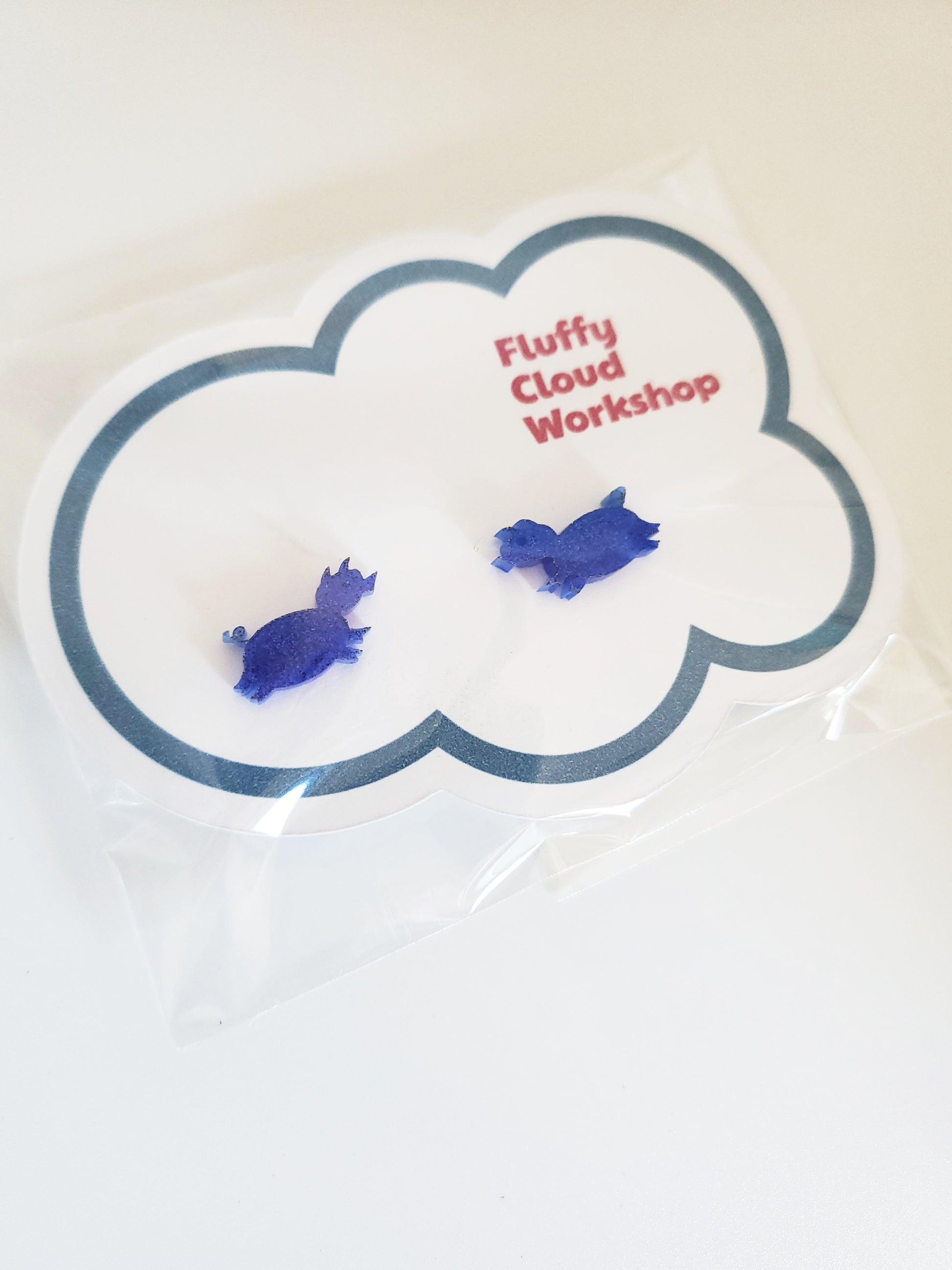 These little stud and dangle earrings are just adorable! Colourful (and quite a few glittery) resin animals are mounted on stainless steel studs. Roughly 0.5 inches wide.