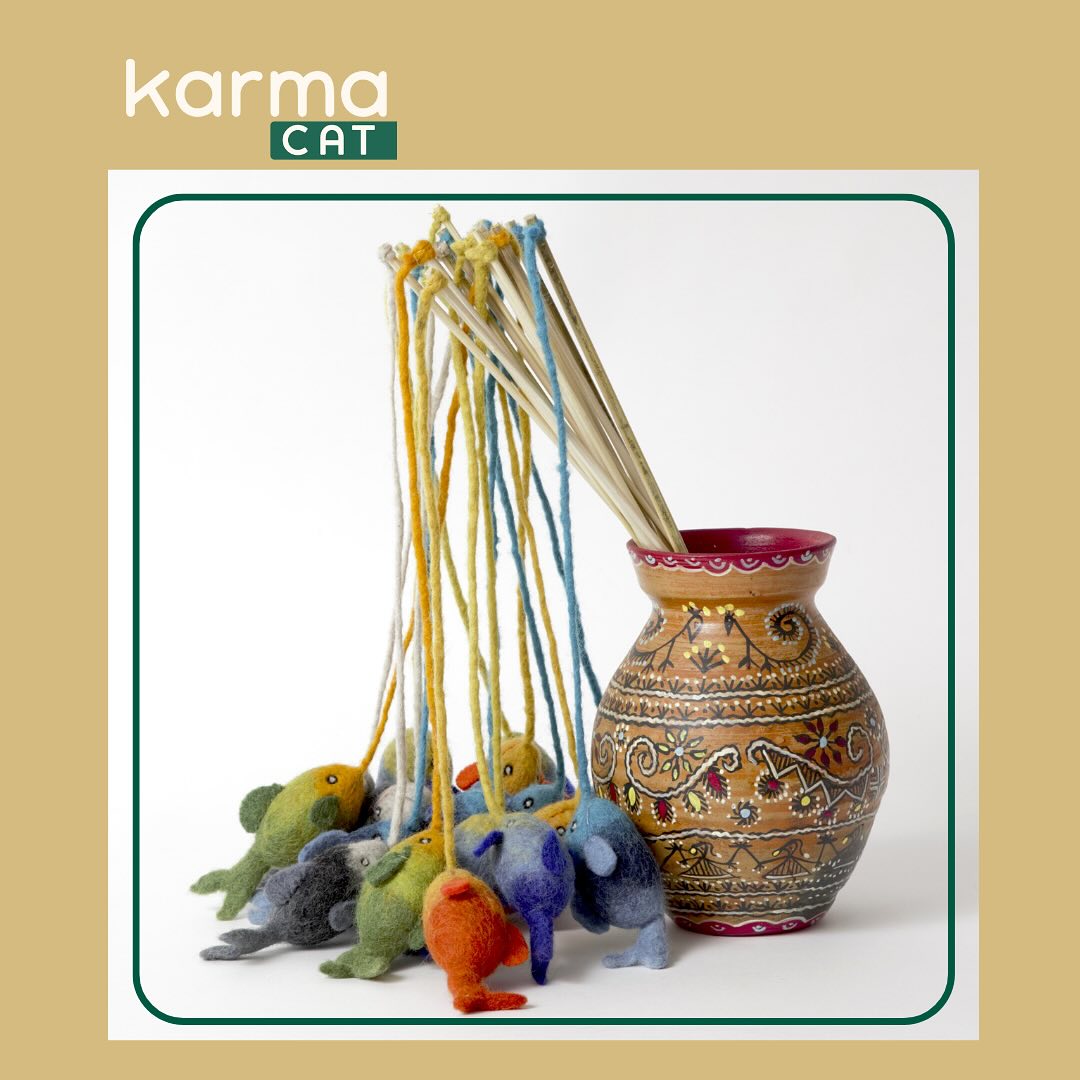 Our Teaser Toys are made of wool and attached to an 18″ bamboo stick. Go fish with our assorted color 3″ fish, attached with a 12″ string. Made of a blend of all natural Himalayan and New Zealand wools, and using AZO free, non-toxic dyes, the lanolin-rich wool naturally attracts your cat and is anti-microbial and odor resistant. Comes in random choice of assorted colors.